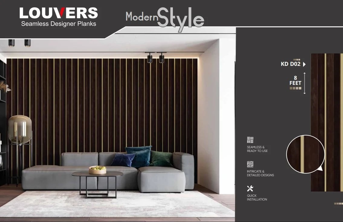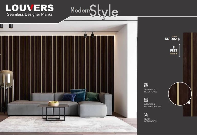 Charcoal louvers are high-end decorative panels designed to create bold, luxurious interiors with rich textures and matte finishes. Available Sizes: 9.5ft x 6 inch, 9.5ft x 12 inch.